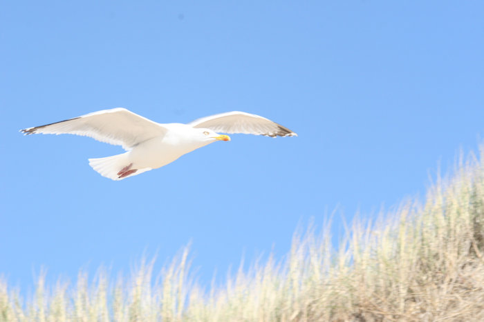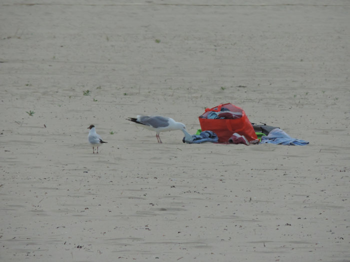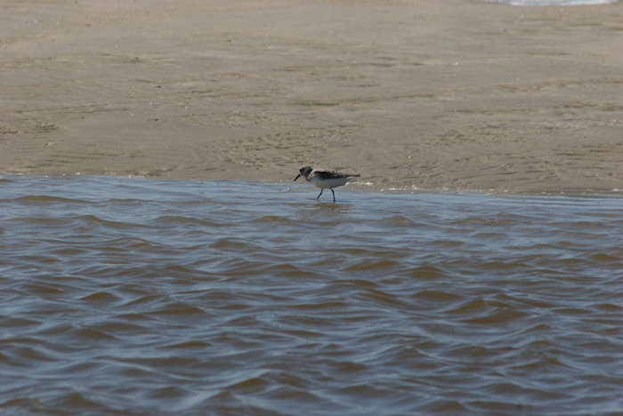 Een eenzame vogel op weg naar Den Helder of Texel. Hij loopt erbij als een badgast die moe is van een hele dag vertier en nu op huis aan gaat.