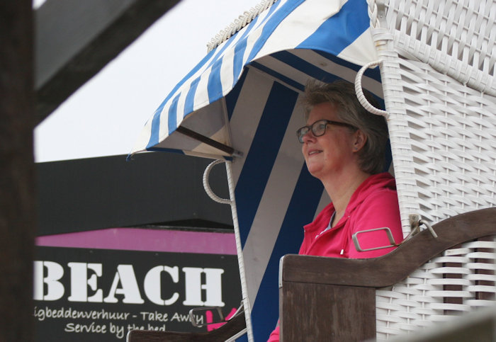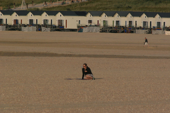 In de avond wordt het wat rustiger op het strand. De meeste mensen zijn niet geneigd de vrije ruimte te kiezen om te gaan zitten zoals deze mevrouw.