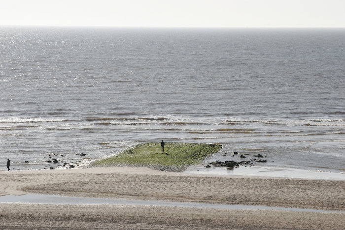 Een strekdam als een voetbalveld in zee. Het beeld wordt versterkt door de man die er midden op staat.