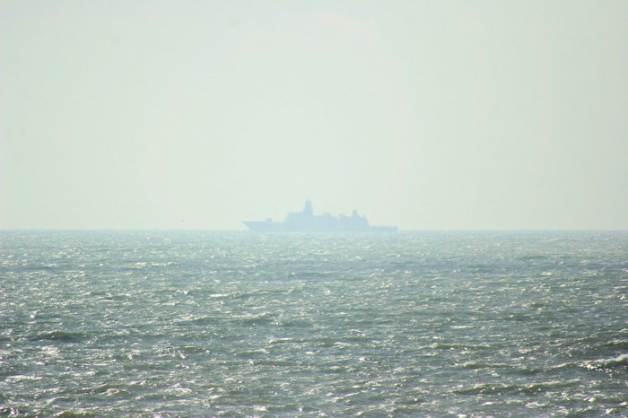 Een modern marineschip met zijn hoekeige radarcamouflagevormgeving verschuilt zich op de ouderwetse manier in de nevel